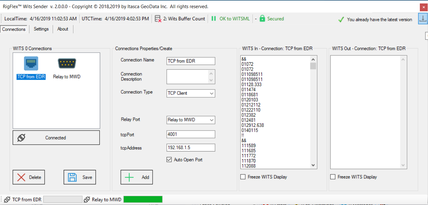 Very small bandwidth requirement compared to compressed WITSML as the heavy lifting is done on the server side. We use the WITS Sender to transfer drilling and gas data to our online RigFlex Servers. All data is stamped with the UTC time relative to the normal local system time so date and time ambiguities are not introduced.